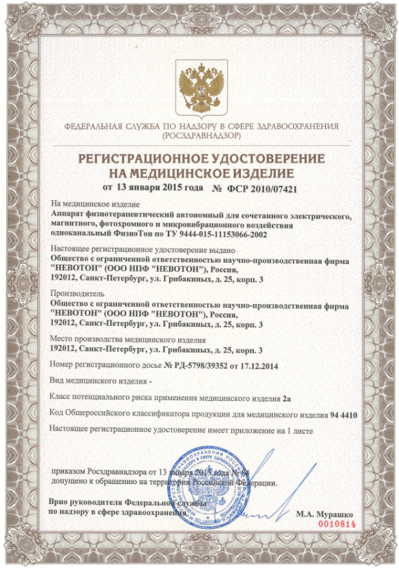 Аппарат имеет регистрационное удостоверение Росздравнадзора. Это не «безымянный массажёр», а официальный медицинский прибор.